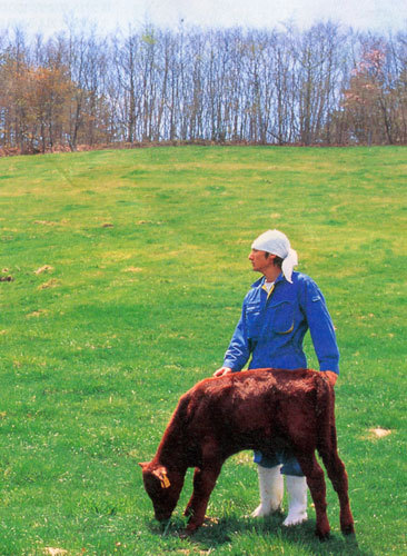 短角牛はというと、春に親子で放牧され(標高800m以上の高原で、1親子に対し野球場一面くらいの広さです。)、夏、牧場で自然交配により妊娠し(人工授精ではなく種牛と交配し妊娠します。母牛40~50頭に種牛1頭。)牧草と母乳で育ち(健康的な問題が起こらなければ雨の日も風の日も、ずっと牧場です。)、秋までたっぷり親子で過ごし(約8ヶ月間一緒。子育てが上手で、お乳の出る期間も長いです。)冬に牛舎で出産。という一年のサイクルで無理なく育てられます。(妊娠期間は約285日。2月中旬~3月頃に出産が集中します。)